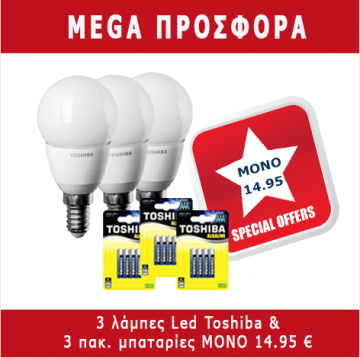 M€GA προσφορά!3 Λάμπες Led Ball Toshiba 4W E14 2700K + 3 Αλκαλικές Μπαταρίες AAA LR03 BP4 Toshiba. Price:24,06€ 14,95€
