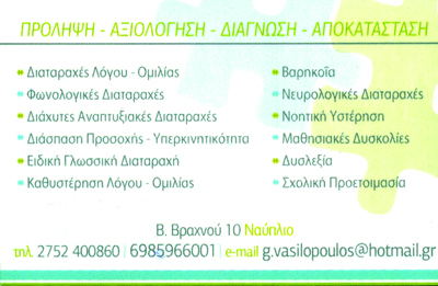 customer tabsΕπικοινωνίαΛογοθεραπεία - Ειδικός ΠαιδαγωγόςΜεταπτυχιακό στην Ειδική αγωγήΔέχεται με ραντεβού Διαταραχές Λόγου - ΟμιλίαςΦωνολογικές ΔιαταραχέςΔιάχυτες Αναπτυξιακές ΔιαταραχέςΔιάσπαση Προσοχής - ΥπερκινητικότηταΕιδική Γλωσσική ΔιαταραχήΚαθυστέρηση Λόγου - ΟμιλίαςΒαρηκοΐαΝευρολογικές ΔιαταραχέςΝοητική ΥστέρησηΜαθησιακές ΔυσκολίεςΔυσλεξίαΣχολική ΠροετοιμασίαΛογοπεδικοί - ΛογοθεραπευτέςΥγείαΒραχνού 10, Ναύπλιο, ΑργολίδαΝΑΥΠΛΙΟ ΑΡΓΟΛΙΔΑΣΑΡΓΟΛΙΔΑΠΕΛΟΠΟΝΝΗΣΟΣ 2752400860 6985966001g.vasilopoulos@hotmail.gr Το προτείνω (έχει προταθεί 0 φορές) ΦωτογραφίεςFacebook LikeShare on FacebookTweet Widget
